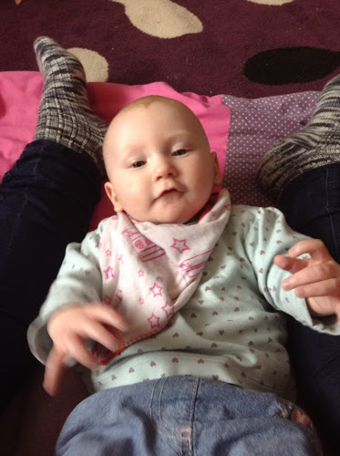 So, what do I get up to? My days vary quite a lot. Hannah has two little girls, Cassie (2) and Felicity (4 months) and they keep her hands pretty occupied so there's not always time for knitting. First thing in the morning is usually a good time, Cassie takes a long time to eat her breakfast and Felicity often plays happily by herself so Hannah can usually squeeze in a few rows then. As Felicity starts to get a bit fussy we move down on to the floor to be close to her and we'll put in a few more rows then. Sometimes only a few stitches will go by before I get put down, Felicity likes to roll onto her tummy but she can't roll back again so she has to be turned over every few stitches. It's amazing how fast I can grow a few stitches at a time.